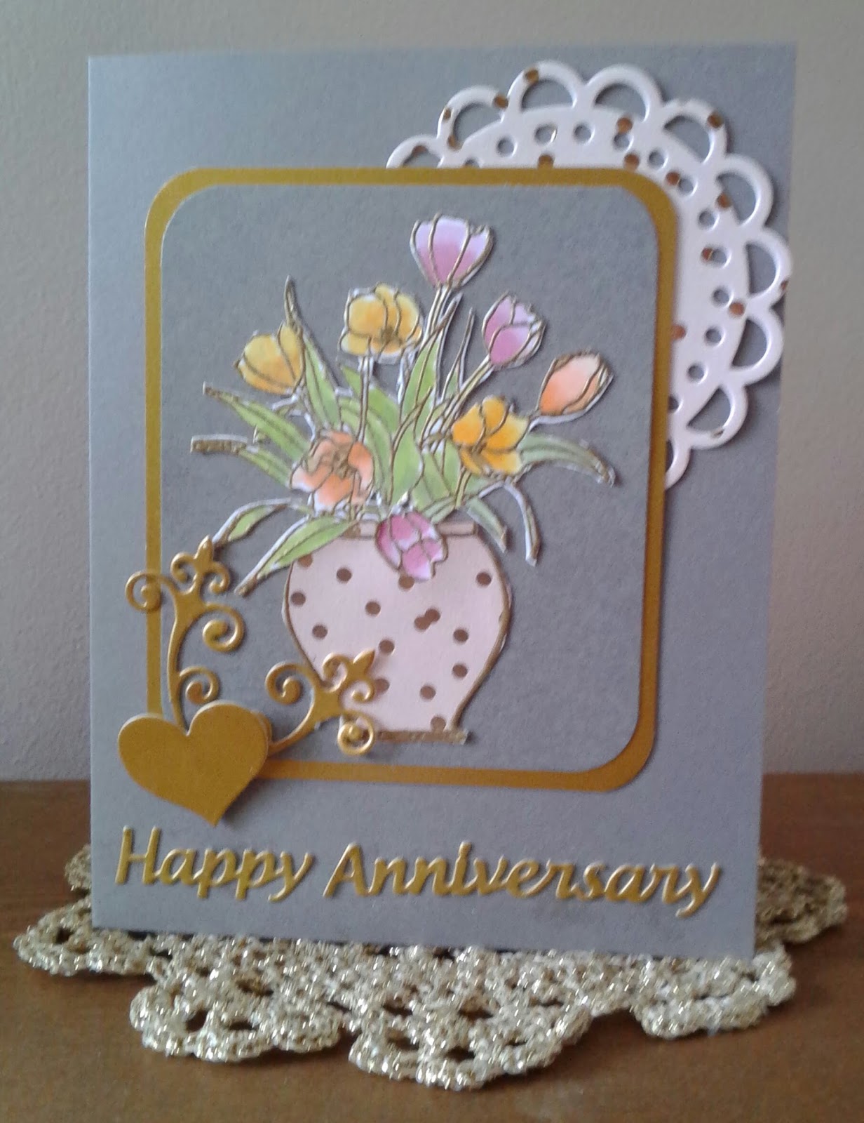 I made this card this morning for my sister-in-law and brother-in-laws anniversary. I used Repeat Impressions Vase of Tulips, embossed in gold which I think gives an elegant look, colored with copics, paper pieced the vase with My Minds Eye papers and used that for one of my many die cuts.
