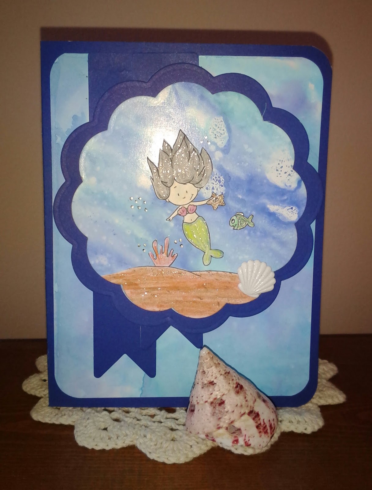 It's very hot and humid here in Missouri so it was a good time to play with Gerda Steiners underwater image for this months progressive challenge, is this not the cutest digi set? I had so much fun with it. I took out some previous polished stone papers and used one for my image and one for the background. I used my Koh-i-nor pencils and a glitter pen and that was all it needed. Hope you are keeping cool and enjoying some creative time.