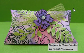 This week our Challenge at The House that Stamps Built is Anything but a Card chosen by Patti. This was quite a challenge for me. Luckily I had just ordered a pillow die cut so I knew I was going to go with that. I dug into my endless stash of alcohol ink papers and found 2 similar ones and a purple one. After die cutting my two pillow box shapes I stamped those and the third sheet with Repeat Impressions: 10201-W Flower Power Background. I cut out a couple flowers from the purple sheet. I also cut a few leaves out of white card stock and colored them with distress inks. Colored some tulle with distress ink and assembled adding a jewel to the flower center. And of course it had to be filled with dark chocolate - my favorite!