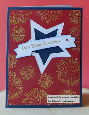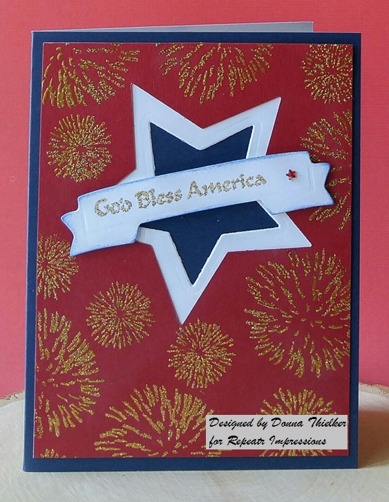 I randomly stamped this amazing fireworks stamp(9014-M, Fireworks) with Versamark ink and then embossed the fireworks and God Bless America(3711-G, God Bless America) with Egyptian Gold embossing powder. Below is a close up of the fireworks: